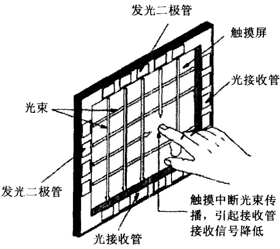 紅外多點(diǎn)觸摸屏是利用X、Y方向上密布的紅外線矩陣來(lái)檢測(cè)并定位人的觸摸手勢(shì)的電子設(shè)備。紅外觸摸屏在顯示器的前面安裝一個(gè)電路板外框,電路板在屏幕四邊排布紅外發(fā)射管和紅外接收管一一對(duì)應(yīng)形成橫豎交叉的紅外線矩陣。手指在觸摸屏幕時(shí),就會(huì)擋住經(jīng)過(guò)該位置的橫豎兩條紅外線,因而可以判斷出觸摸點(diǎn)在屏幕的坐標(biāo)位置。任何非透明物體都可改變觸點(diǎn)上的紅外線而實(shí)現(xiàn)觸摸操作。
